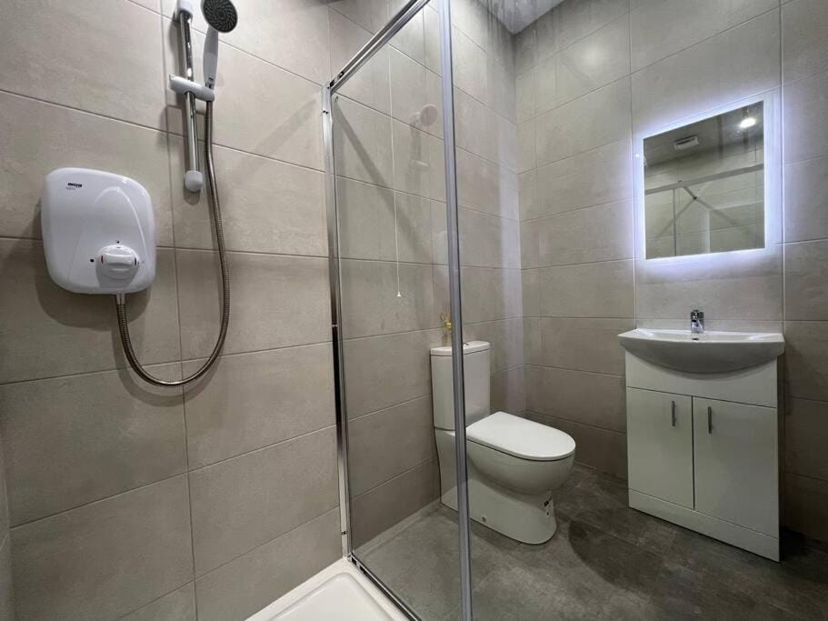 There was plenty of bedrooms 1 down stairs to with a shower and toilet en suite. We were going to the new dexcom rugby stadium didn't take long to walk. Near to shops restaurants and pubs. Kettle, towels everything provided. Comfy beds very clean.