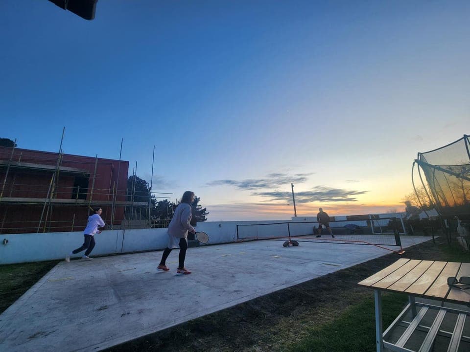 Ook buiten is er veel ruimte om te genieten, met een trampoline, terras met vuurplaats en een eigen pickleball veld.