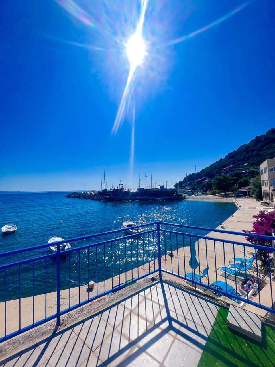 Het uitzicht, je sprong vanuit het appartement zo de zee in. Het dakterras was helaas niet bruikbaar maar prima opgelost door de Host! Er is een wasmachine aanwezig, heel fijn!!