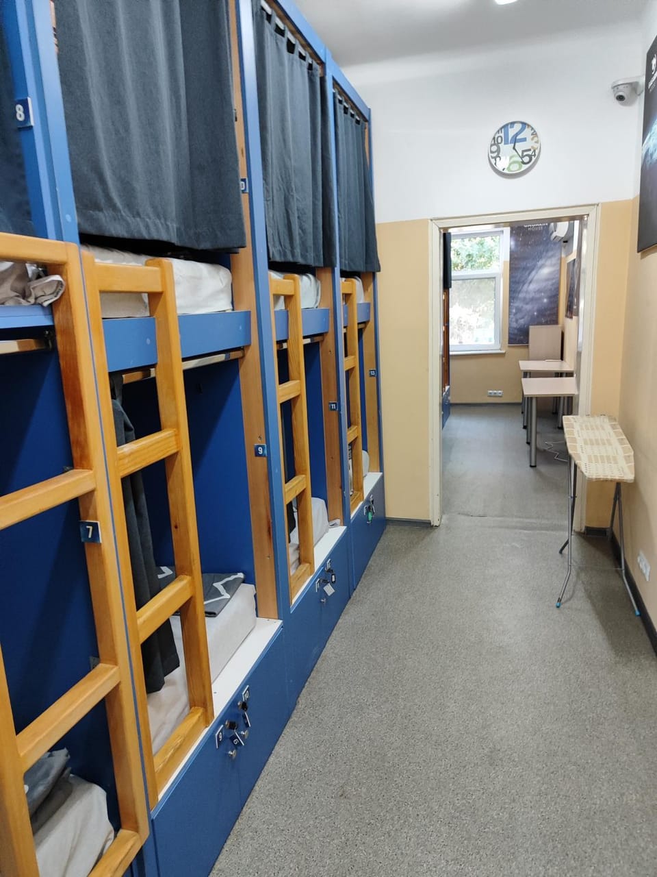 W pokoju 16 kapsuł z łóżkami - przy naszej wizycie oprócz naszej dwójki były tylko dwie osoby, więc było cicho. W każdej kapsule lampka ścienna i kontakt. Kapsuły do spania maja wystarczającą ilość miejsca. W pokoju wysoka temperatura, na klimatyzacji widniało 29 stopni. Materac dosyć miękki, troszkę się zapadał. Pod każdym łóżkiem miejsce do przechowywania rzeczy zamykane na kluczyk. Jeżeli chodzi o łazienkę: jedno pomieszczenie kibelek i umywalka, drugie z kibelkiem i prysznicem - prysznic nie jest niczym oddzielony, woda leci bezpośrednio na całe pomieszczenie. Jeżeli chodzi o czystość było poprawnie, niedokładnie ale generalnie posprzątane.