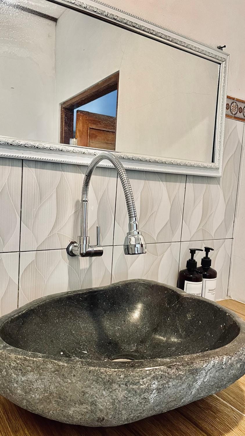 Stones in the outdoor shower hurt your feet when showering,