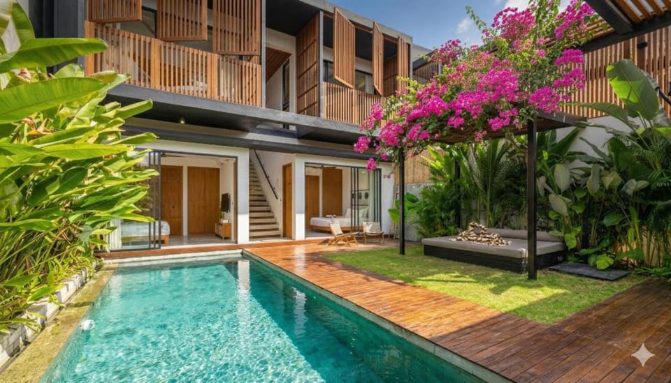 A 7-minute walk from Echo Beach in Canggu, 4BDR NEW Luxe 350m to BEACH villa I KIDS stay free I Living panoramic windows I AC I 9 meters pool provides accommodations with access to an open-air bath.
