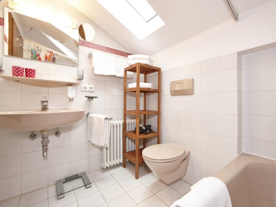 Es gibt keine richtige Dusche - nur eine Badewanne mit Duschvorhang in der Dachschräge. Macht das Duschen etwas schwierig