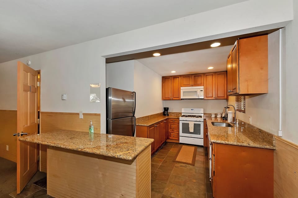 ✓ Kitchen: Features a fridge/freezer, gas range/oven, microwave, dishwasher, standard coffee maker, toaster, and blender.