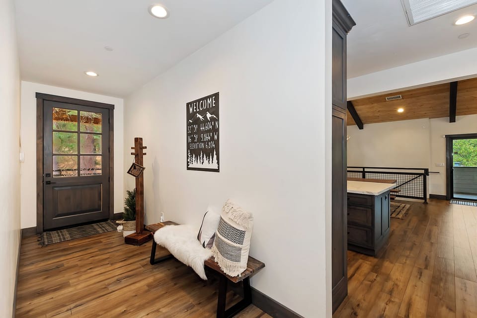 Step through the oversized front door and be welcomed by rich hardwood floors that lead into the open-concept living area. Vaulted ceilings and wood beam accents frame the space, creating a warm, inviting atmosphere. The living room features a leather L-shaped couch, a floor-to-ceiling rock gas fireplace, and a large flat-screen smart TV. Enjoy the peek-a-boo views of the lake and the perfect setting for relaxation and entertainment.