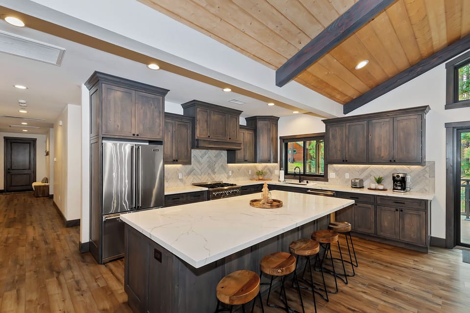 The gourmet kitchen is equipped with everything you need to create memorable meals. Featuring an oversized island, Thor oven, Viking stainless steel appliances, coffee maker, and toaster, it's a chef’s paradise. The adjacent dining area, with a beautiful wood slab table and antler chandelier, offers a stylish setting for group meals. Step outside to the deck for al fresco dining with a golf course backdrop.