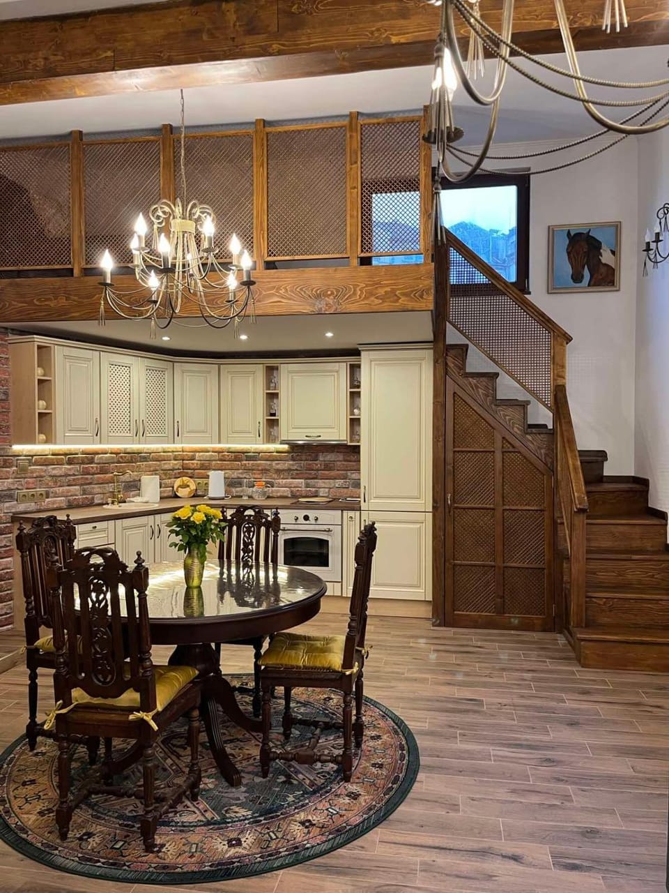 the apartment is very big with a cozy living room. and it offers complete kitchen and cutlery. many vintage furnitures and decoration.