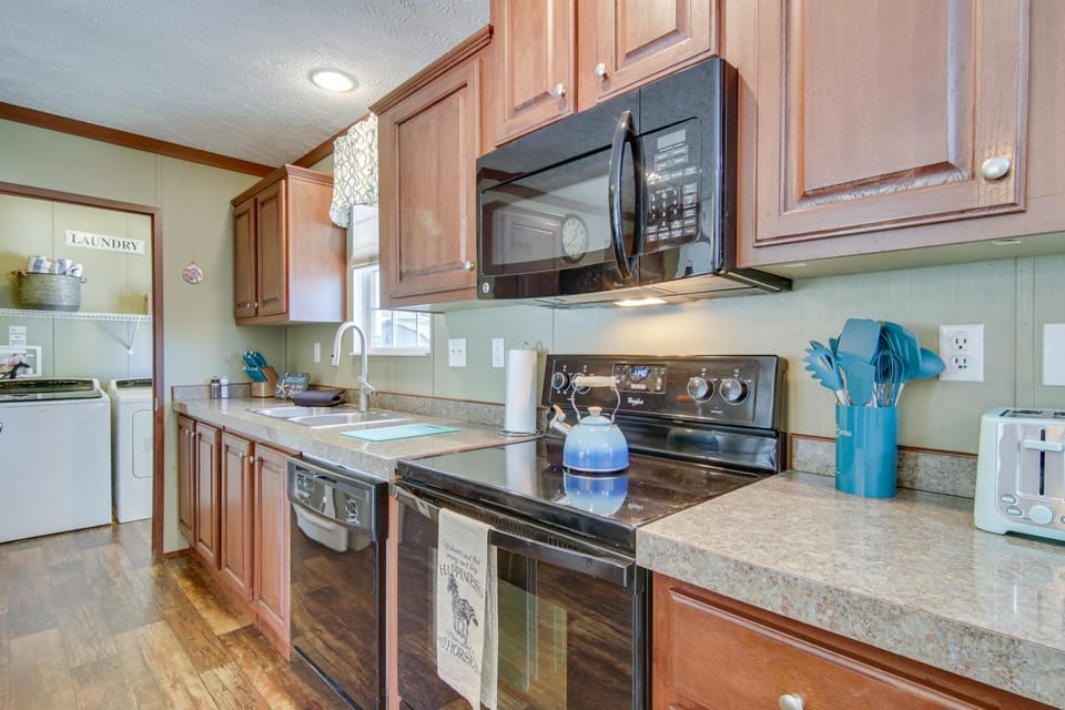 What amenities are available at Beach Bay Pony Place with Ponies 1 Mi to Water!?