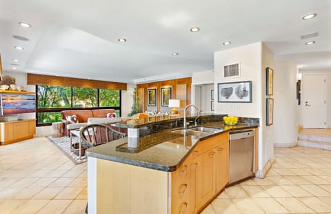 The modern chef's kitchen is fully equipped with all the necessary cookware, allowing you to create the perfect meal or refreshment. The in-suite dining area directly overlooks Kaanapali Beach and the crystal blue ocean beyond.