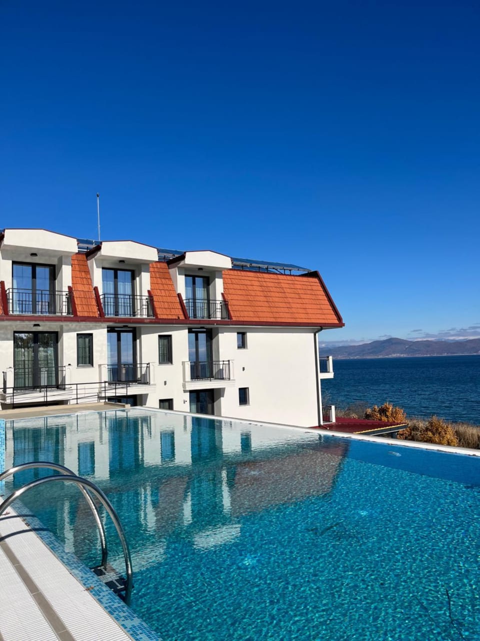 Modernes, in sehr ruhiger Lage am Ufer des Ohrid-Sees kurz vor der nordmazedonisch-albanischen Grenze gelegenes Hotel. Das Dishli liegt ca. 11km von Struga entfernt, man ist also auf ein Fahrzeug angewiesen. Ein direkter privater Zugang zum See ist vorhanden, am See selbst waren ausreichend LiegestĂŒhle und Sonnenschirme aufgestellt. Ausserdem verfĂŒgt das Hotel ĂŒber einen sehr schönen Infinity-Pool (mit Pool-Bar) mit Sicht auf den See.