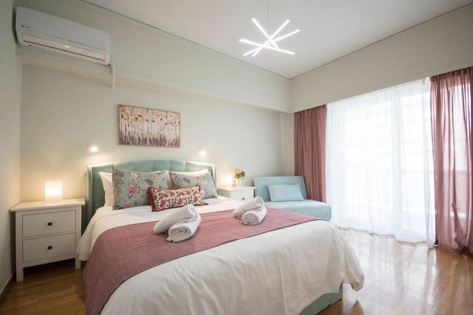 A two-bedroom apartment in a nice building in the center of Faliro. It has all the amenities, from a coffee machine to a blender and a dryer. It's very well heated in winter; we never felt cold.