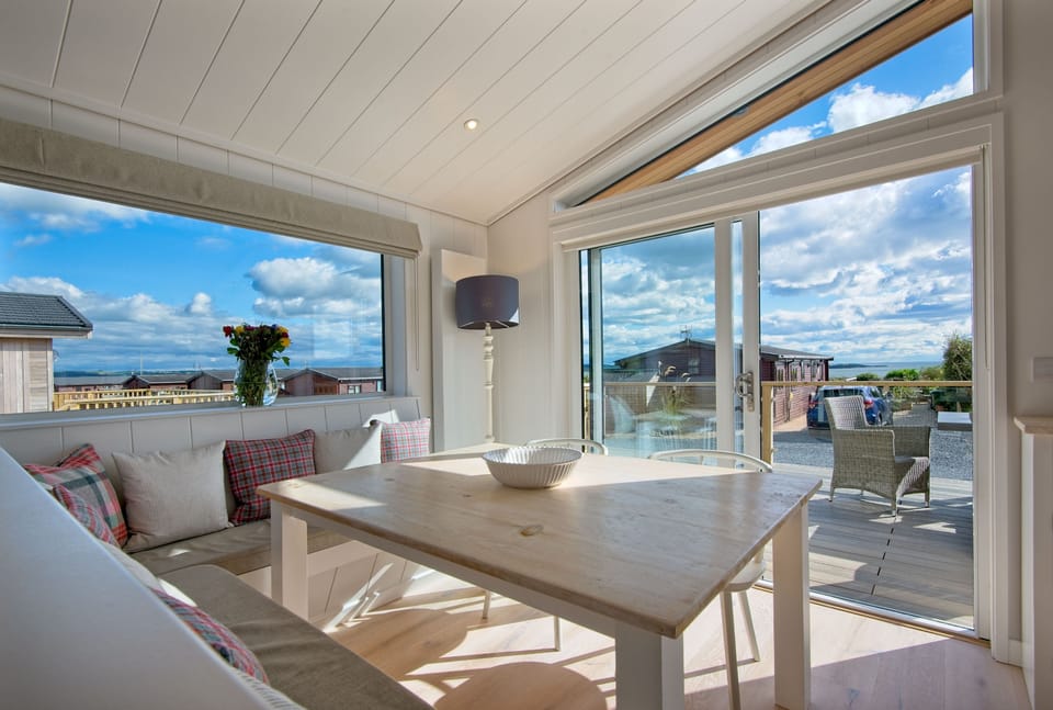 The lodge has a wonderfully spacious open plan kitchen/dining/living area with doors that open on to an enclosed deck overlooking Fleet Bay to the front, with evening sunsets and views to Ben John & the Galloway Hills from the rear of the lodge. Set on the headland, in a group of 5, these lodges are ideal if you wish to be accommodated together as a group.