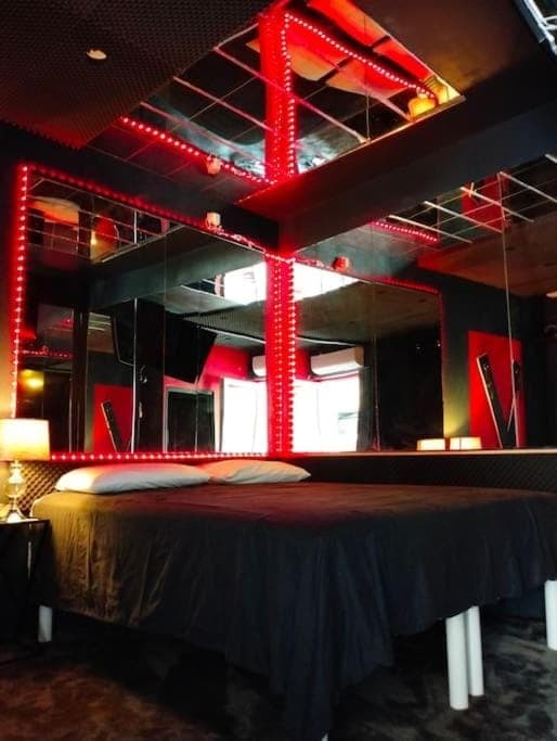 Chambre bien équipé et surtout belle ambiance avec les lumières à led. Lit confortable at très beaux le jeux de miroirs