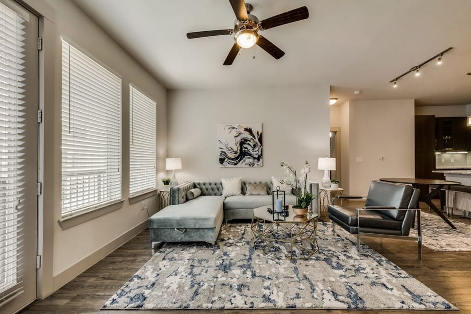 Executive 5th-floor, fully furnished, non-smoking 2BD/2BA apt (1437 SQft) in an upscale community with a 1 king bed and 2 twin beds, garage parking, a 24-hr fitness center, pools, and washer/dryer, club lounge, parking garage. Tastefully furnished for professionals, an ideal space to unwind. Close to Spring Creek Trail and Fire wheel Golf Park, and with easy access to major Highway 75. Review the "OTHER THINGS TO NOTE" section for more details.