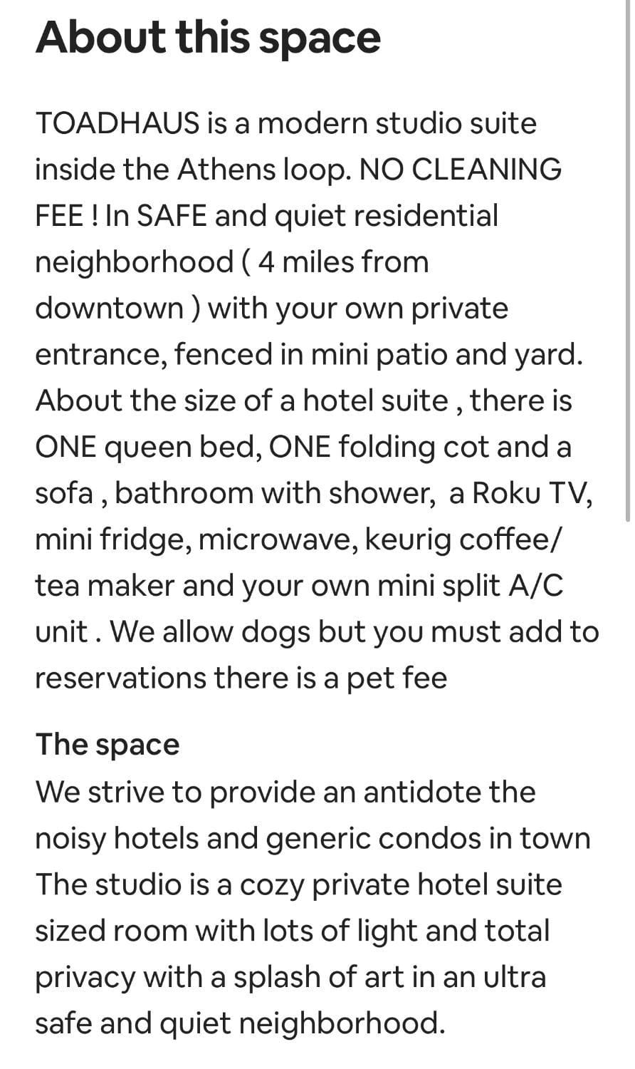 It was very clean and had all the amenities you need for a wonderful stay. The neighborhood is very quiet and safe. The bed slept fine and the AC/Heat worked great. I appreciate the effort that the owners put into my stay. If I have business again in Athens I’ll be staying here and I highly recommend it.