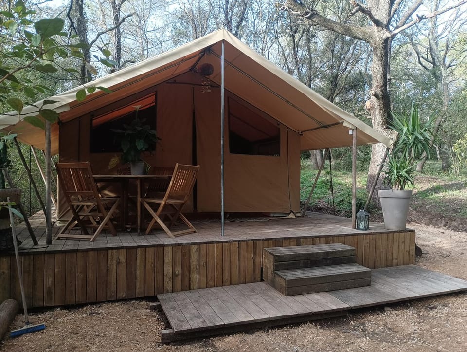 L'emplacement au top pour aller au Pont du Gard à pied. C'est du camping mais avec tout le confort. L'ambiance safari est là grâce à la déco choisie. L'hôte est très sympa.