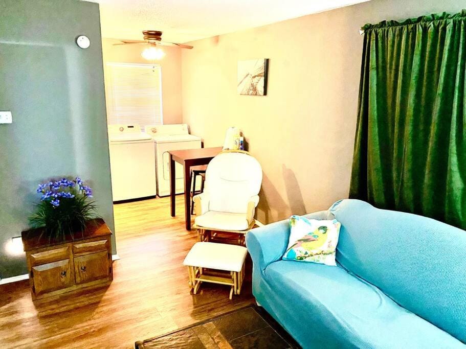 The apartment was a pleasant surprise after entering through a slightly sketchy area. It’s clean, well appointed and a decent size with full kitchen with full size refrigerator/freezer and washer /dryer.