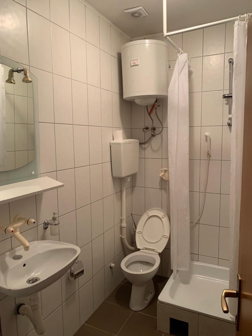 The bathroom was terrible. The mirror had a shelf and was about to fall off. One day a pipe broke behind the toilet and flooded the bathroom. Water kept running out of the shower. The faucet is outside the shower.