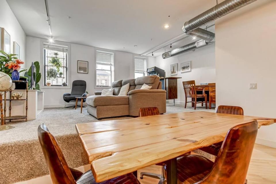 The view of the old state capital, the nice sized kitchen, comfortable king bed. Kitschy card catalog. Vintage lighting in dining area.
