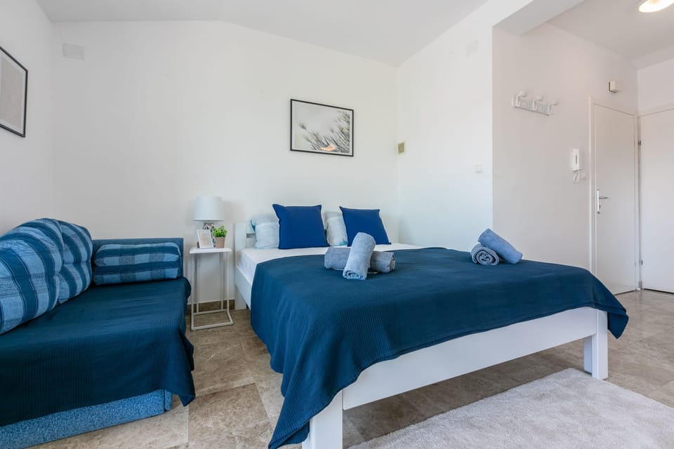 Studio flat can accommodate 2 guests. Beds are situated in living room, within 21m2. Guests can use a private balcony to enjoy the warm summer evenings. The studio offers the sea view. Food can be prepared using barbecue which is shared with other guests too.
