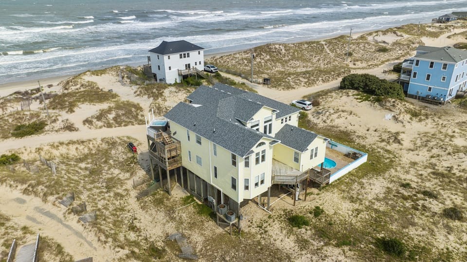 Your home away from home in the Corolla 4x4, features 7 bedrooms, 6 full baths and 2 1/2 baths. 2 king master suites, 3 queen beds, 2 full beds, 2 sets of bunk beds, there's plenty of space for everyone to unwind and relax. Immerse yourself in the charming atmosphere of this house, complete with amenities like STARLINK, Alexa concierge, AC, Dish satellite, ping pong/pool table, video arcade, bar fridge with sink in the game room, hot tub overlooking the ocean, pool with shade cover, speedy queen washer and dryer, water filtration system for fresh smelling, clean water, a countertop ice maker, roborock vacuum downstairs and upstairs, iron, ironing board, hairdryers and all linen and bath towels are provided. This home has a fully stocked kitchen with double oven, microwave, coffee pot, 2 dishwashers, large refrigerator/freezer, air fryer, rice cooker, skillets, food processor, and a Margarita Key West Frozen concoction maker! Quick walk to the beach and 4 miles from Hardtop!