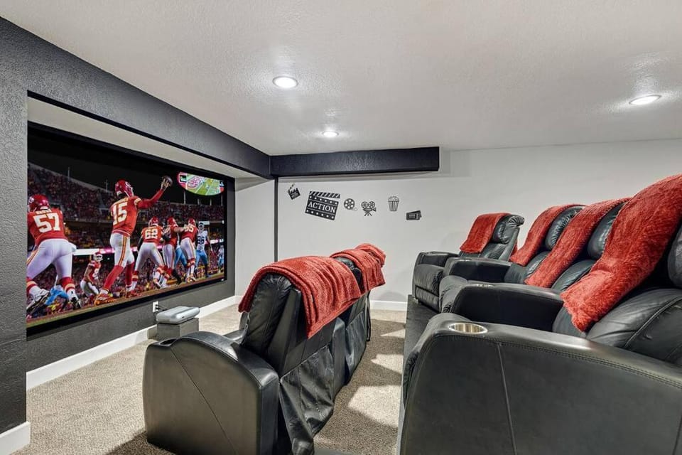 What amenities are available at HUGE Golf course Family home-FREE Heated Pool-Theater-Gym?