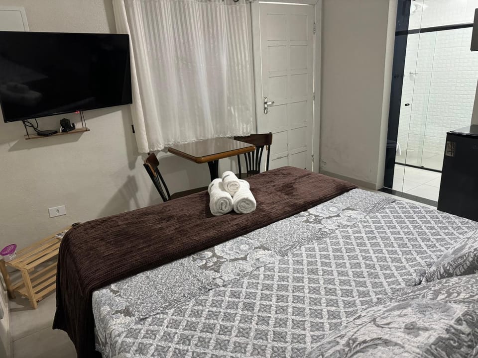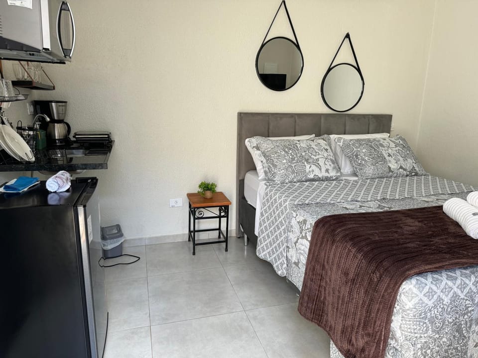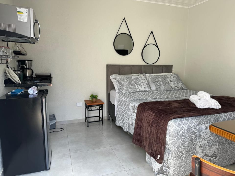 É ideal para quem tem carro. A vista é linda durante o amanhecer durante as saídas do quarto. O quarto é equipado, tem ar, tem lençol. A cama é excelente. A cozinha possui cafeteira, frigobar, saundicheira, pratos, talheres e copos.