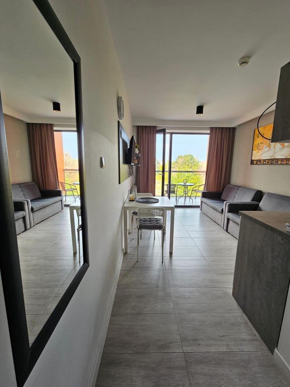 Apartament czysty, pachnący, nowocześnie urządzony, z fajnym tarasem, wyposażony we wszystko co potrzebne. Pani właścicielka przemiła, otwarta na wszelkie dodatkowe potrzeby. Miłym zaskoczeniem był ekspress do kawy i w ogóle zestaw powitalny. Budynek/apartamentowiec położony w cichym miejscu, w bliskiej odległości od morza, z windą, dostępnymi śniadaniami, salą ze stołem do tenisa. Wszystko na ogromny plus.
