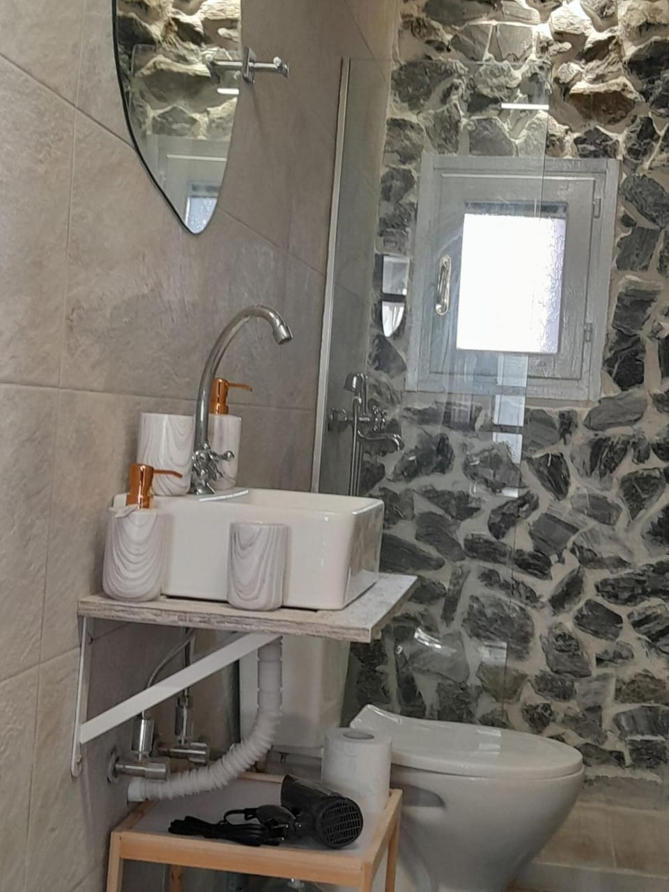 La salle de bain est vraiment peu pratique : très petite, avec une douche sans rideau ni porte qui éclabousse partout, et des toilettes mal positionnées.