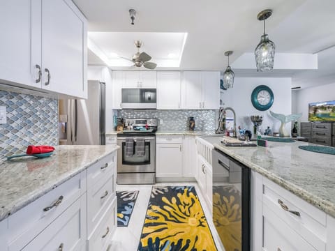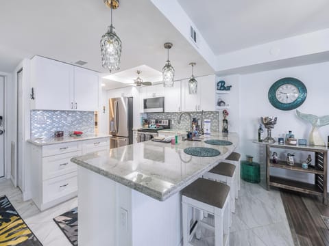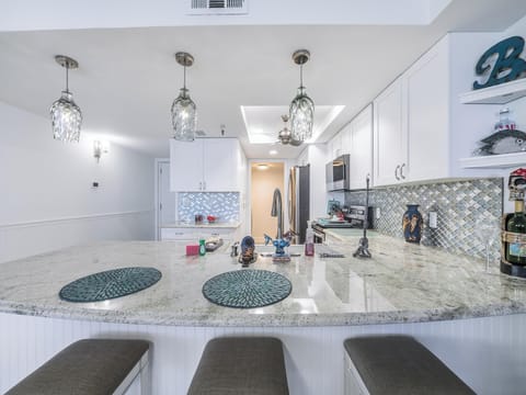 This exquisitely remodeled two-bedroom, two-bathroom condo welcomes you to take in the soothing sound of the breaking waves while you relax in the warm, seaside air.