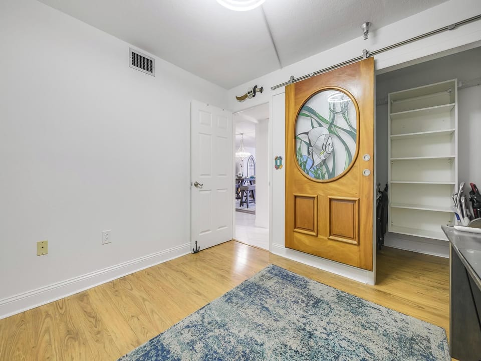 Family interaction is greatly enhanced by the open floor plan. Two sofas are in the den. One features a big flat-screen TV and a pull-out sofa. Two sets of sliders with views of the Gulf of Mexico are located in the sitting area.