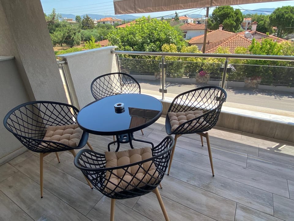 La posizione, secondo il mio punto di vista, è eccellente se si ha voglia di girare la penisola Calcidica nella sua interezza. Infatti sei a metà perfetta tra il primo e il secondo dito e con un'ora massimo di macchina raggiungi tutte le spiagge più belle. Inoltre, a 150 mt a destra uscendo di casa c'è il ristorante più buono di tutta la zona, e a 150 mt a sinistra un market estremamente fornito. Quindi, nuovamente, fantastica posizione. La casa è nuova, abbastanza curata, e gli spazi sono ampiamente sufficienti per una coppia. Fantastico lo stendino sul balcone in camera con affaccio a ovest. Tenda da sole e zanzariere molto belle! Aria condizionata ben funzionante!