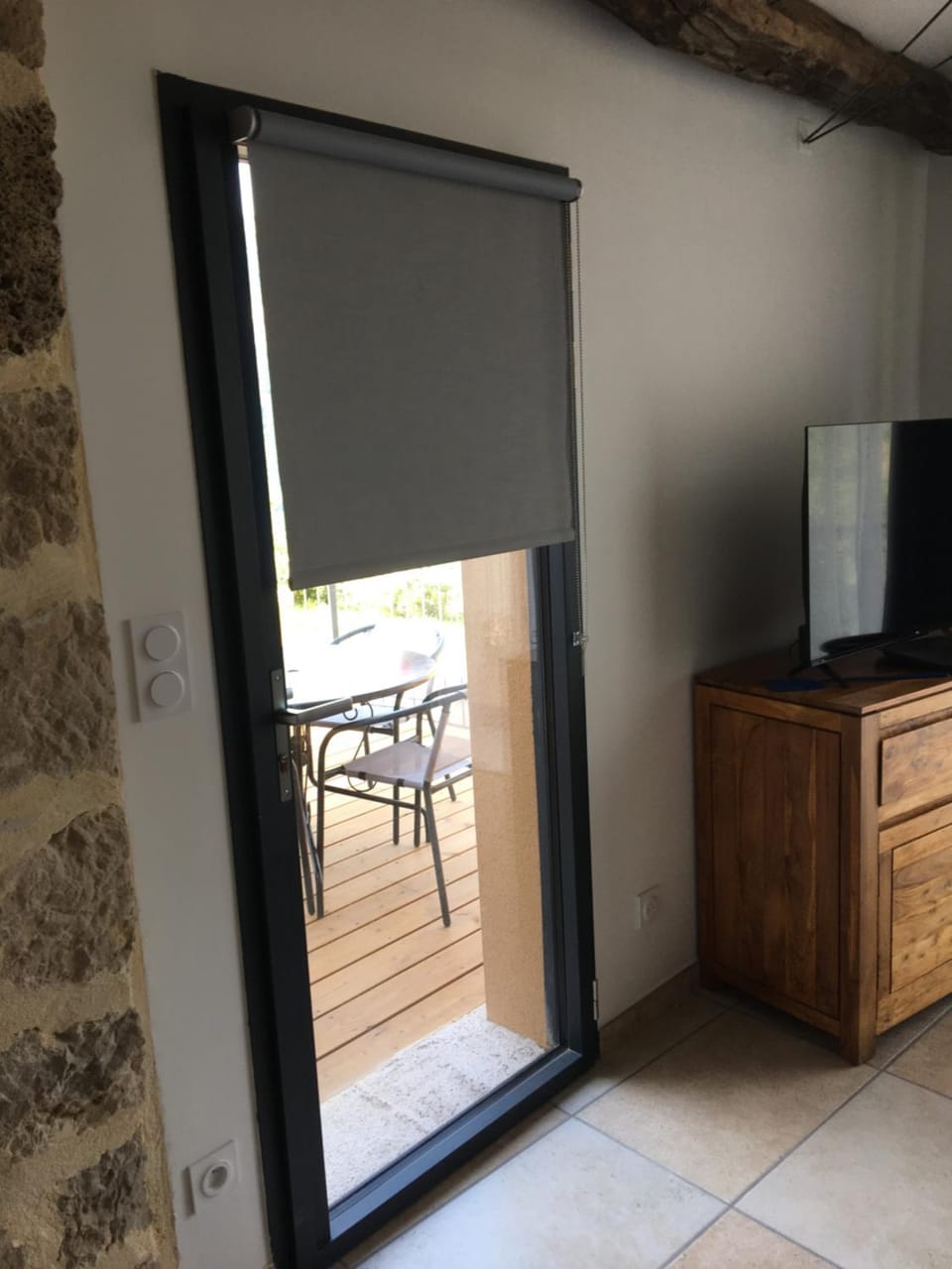 A savoir : il n’y a pas de porte pour séparer la salle de bain/wc du reste du logement, et il y a un peu de vis à vis (passants dans le village /voitures) mais résolu avec les stores baissés !