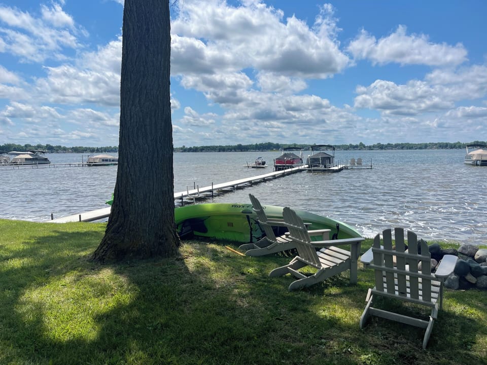 Back at the apartment, you will stay separately from the owners. The apartment is above our game room which is an extension off of the garage. As you ascend up the stairs, you come to the entrance of the apartment. The first space you enter is the living area where a futon (queen), and a chair reside overlooking our garden and the woods in the back of the property. The next space is a full galley kitchen with a full size refrigerator, oven and range. Coffee and tea are provided. As you walk toward the front (lakeside) of the property, you will encounter a queen size bed, a Roku TV, and a dormer window with a built in desk. The window at the west side of the property affords a view of the lake, treehouse and swingset. The full bath follows the galley kitchen and the main queen bed is adjacent to the bathroom.