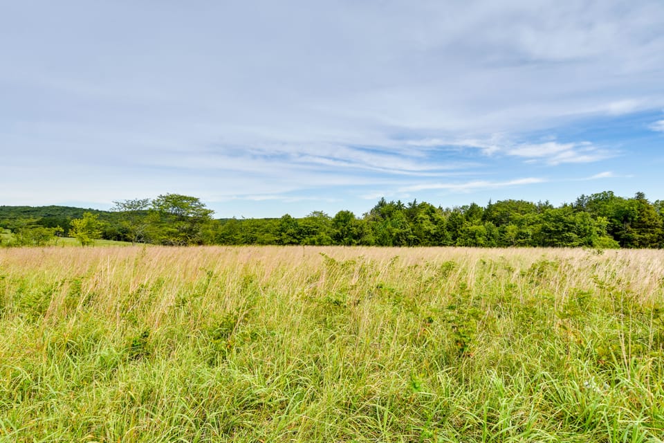 OUTDOOR LIVING: Deck w/ umbrella-covered dining area & electric grill, backyard w/ fire pit, Mark Twain National Forest access on-site