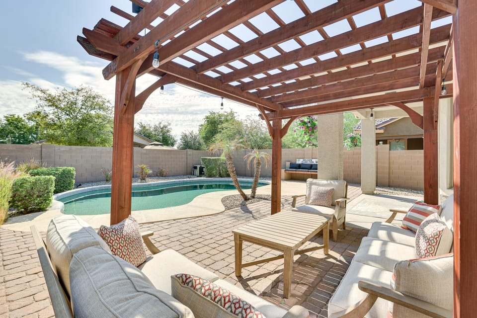 Escape to the breathtaking beauty of Surprise, AZ, when you stay at this 3-bed, 2-bath vacation rental! Nestled in a serene desert neighborhood, this home is perfect for your next getaway. Relax by the pool — heated for a fee — savor meals on the patio, and catch glimpses of F-35 and F-16 jets in action from Luke Air Force Base! With easy access to nearby attractions, like Spring Training facilities, hiking trails, and world-class golf courses, this house offers endless entertainment options.