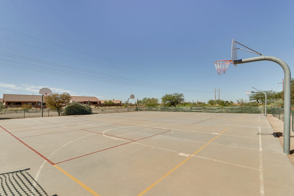 OUTDOOR LIVING: Private pool (not heated, depth 3’-6’), dog door, lounge chairs, 2 umbrellas, covered patio, gas grill, dining area, community pickleball court, basketball court & playground, near Sonoran Desert protected land