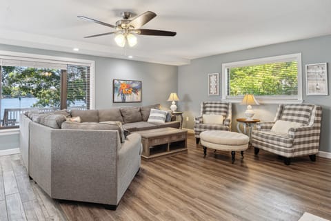 INDOOR LIVING: Smart TV, wood-burning fireplace, dining table, sectional sofa, open floor plan, picture windows, lake decor