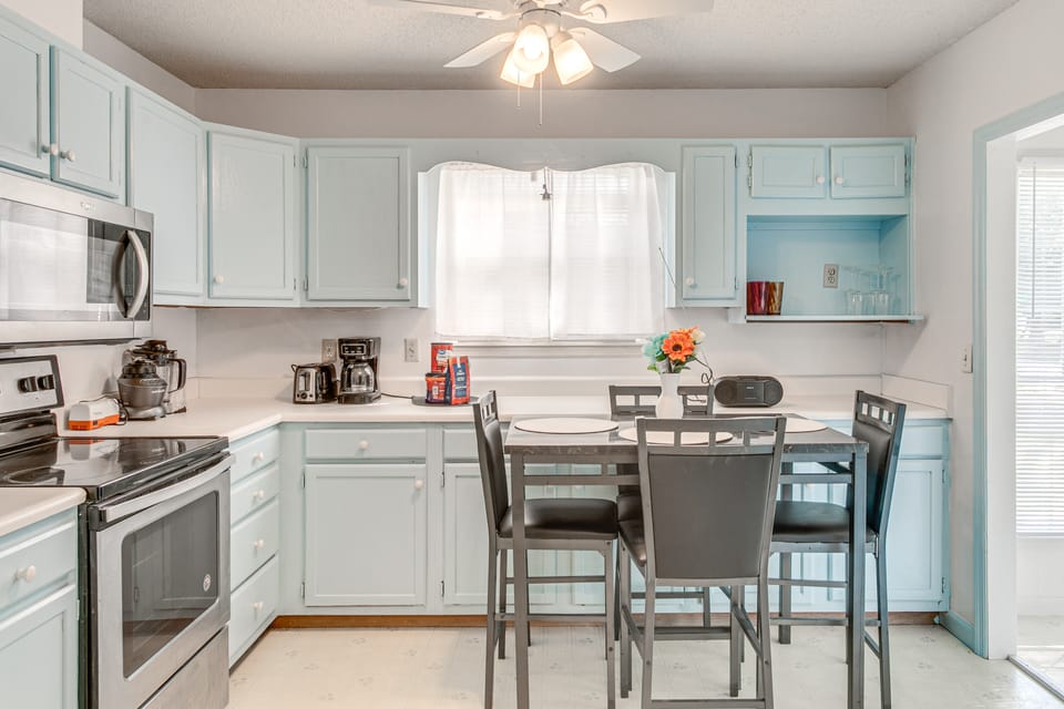 KITCHEN: Cooking basics, blender, coffee maker, dishwasher, stove/oven, refrigerator, microwave, dining table, dishware & flatware, toaster