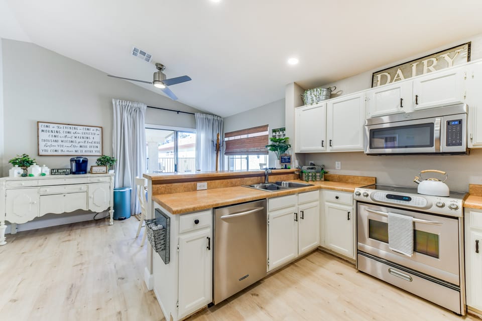 Step into paradise when you stay at this 2-bedroom, 2-bathroom Gilbert vacation rental. With plenty of at-home amenities and a beautiful interior, you and the family are sure to have a perfect extended trip in sunny Arizona! The community pool is the perfect place to spend the day and work on your tan, but when you feel like getting out of the house, be sure to check out shopping, golfing, and dining — all conveniently located near this pet-friendly Arizona vacation rental.