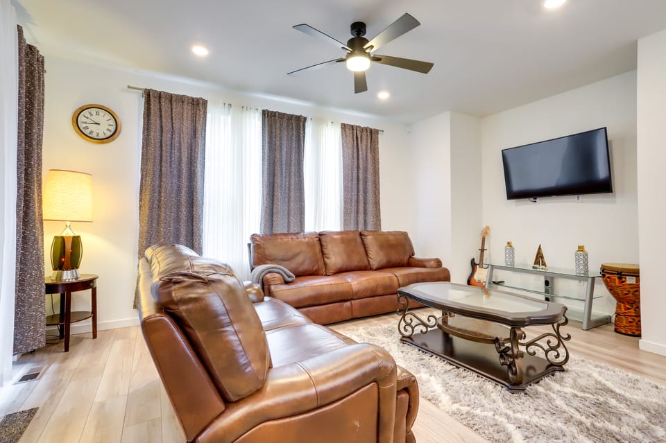 Escape to the Denver area with your family or friends and book this 3-bedroom, 2.5-bath Commerce City vacation rental! This townhome features 4 Smart TVs, a fully equipped kitchen, and access to the area’s most popular sites. Sip your morning coffee on the furnished deck, then gather your gear and explore Barr Lake State Park! If you’re hoping to golf, tee off at Buffalo Run Golf Course. Traveling with kids? Visit the sea life at the Downtown Aquarium!