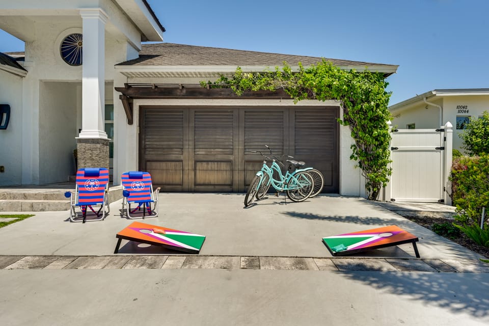OUTDOOR LIVING: Private heated pool, gas fire pit & gas grill (propane provided), patio w/ dining area, chaise loungers, fenced yard, 6 beach chairs, beach towels, 2 bicycles, cornhole