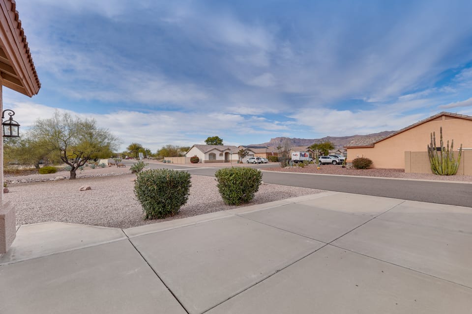 Spend some time relaxing in the warm desert air with this 3-bedroom, 2-bathroom vacation rental in Gold Canyon as your base. This beautifully appointed home is ideal for an Arizona getaway to spend time with friends and family — barbecue out on the patio, have a cornhole competition in the backyard, or watch the sun setting over the Superstition Mountains. Meanwhile, head out to hit the links at Gold Canyon Golf Resort or lace up your boots and pick a hiking trail to explore.