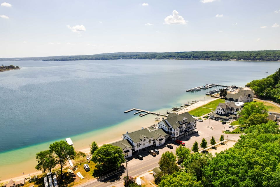 Discover the perfect lakefront retreat at this charming Onekama vacation rental! With its modern interior, luxury amenities, and stunning view, this 2-bed, 1-bath condo offers the ultimate getaway to Portage Lake and Lake Michigan. Take a dip in the waterfront community pool, embark on a boating adventure, or lounge on the sun deck. Later, whip up a meal in the full kitchen and enjoy dinner on the balcony. Whether you seek relaxation or adventure, you’ll love having this condo as your base!