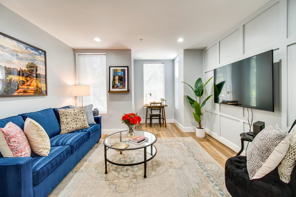 Book your next Alexandria getaway at this 1-bed, 1.5-bath apartment! Boasting a modern interior and a prime location in the Old Town historic district, this vacation rental is a perfect home base for exploring all that the area has to offer. Venture out and you can visit numerous nearby boutiques and restaurants, take a 1-mile stroll to the waterfront, or take the Metro to visit the National Mall. After active days, retreat to the well-appointed interior to relax while watching the Smart TVs.