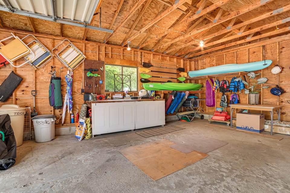 OUTDOOR LIVING: Deck, outdoor seating & dining, fire pit, 2 kayaks, 4 adult bicycles w/ helmets