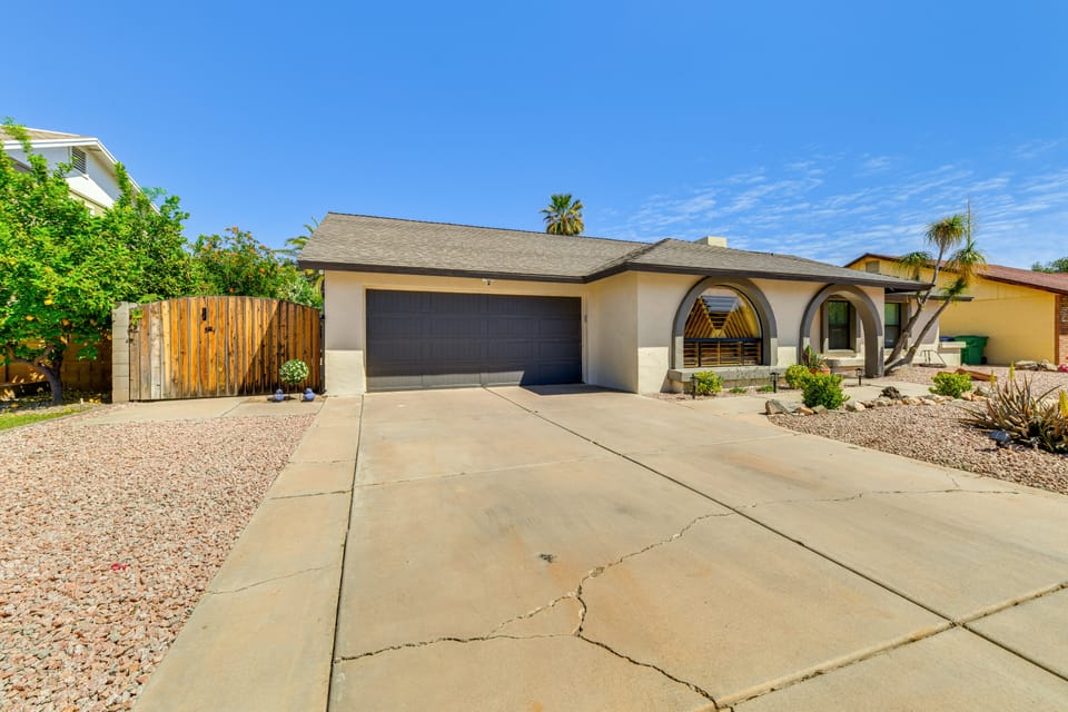 Sun-soaked days and starry nights await at this 4-bedroom, 2.5-bath vacation rental in Mesa, Arizona. After a day spent golfing, hiking, or watching spring training, you can retreat to the comfort of this well-appointed home. Situated in a quiet neighborhood, this peaceful abode is ideal for families and friends. Spend the day lounging by the private pool or unwind inside by the Smart TV! When evening comes, you can fire up the grill for a delicious BBQ on the patio. Book your oasis today!