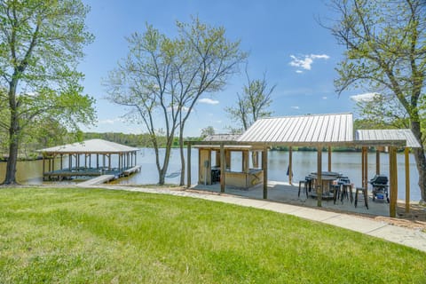 OUTDOOR LIVING: Private boat ramp, 2 boat slips, boat dock, deck w/ dining area, outdoor bar area, gas grill, fire pit, lounge seating, kayak & canoe, life vests, beach towels