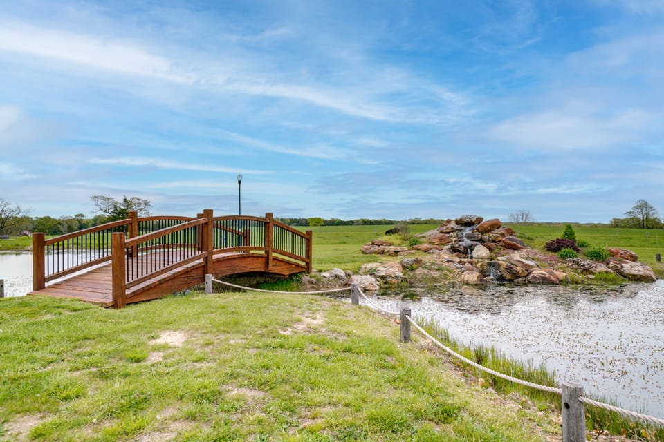 Nestled on 320 acres, this inviting 4-bedroom, 4-bathroom vacation rental is the perfect country escape for your family or friends! Walk along the property's tranquil pond with a loved one, or visit the on-site White Mule Winery for a delicious steak dinner. This charming Owensville home also features a covered patio, a Blackstone grill for barbeques, and multiple en-suite bathrooms. Hoping to have some outdoor fun? Take a day trip to the amazing Meramec Caverns!