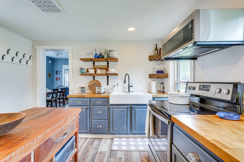 COUNTRY KITCHEN: Cooking basics, stainless steel appliances, breakfast bar w/ seating, spices, dishware & flatware, toaster, coffee bar w/ Keurig coffee maker & electric kettle (coffee & tea provided)